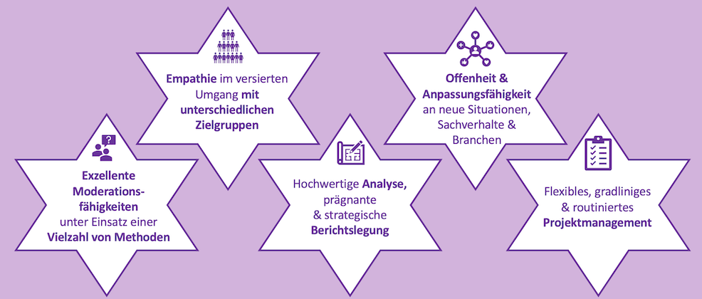 Durch Offenheit, freundliches Entgegenkommen und Empathie gelingt es mir, in einer angenehmen und der Zielgruppe passenden (Gesprächs-)Atmosphäre die verschiedensten Persönlichkeiten aus der Reserve zu locken, um ehrliche Antworten und konstruktive Anregungen zu bekommen.