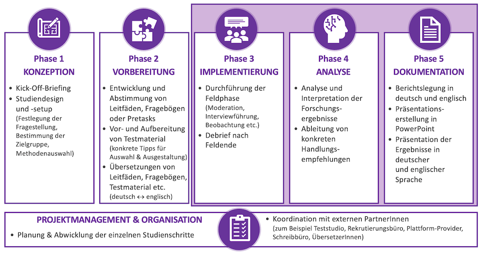 Von Studiendesign, über Feldvorbereitung bis zur Projektdurchführung achte ich auf optimale Voraussetzungen, damit alles reibungslos und zielführend umgesetzt wird: