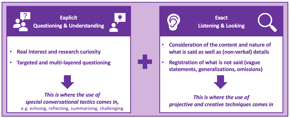 As a trained and experienced interviewer and moderator, I use (psychological) interview and moderation techniques in a targeted way to elicit the real opinions and actual views of the interviewees and thus generate true insights: